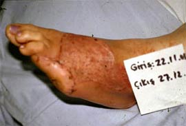 C: Parmak amputasyonları ve ayak sırtına deri greti yapıldı. Alt bacak bölümünde nekrotik dokular uzaklaştırıldı. Yara sutürle kapatıldı. 1 aylık hastane tedavisi sonunda elde edilen erken sonuç görülüyor. |