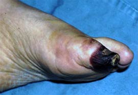 A: Tırnağı derin kesme sonucu baş parmakta kuru gangren |