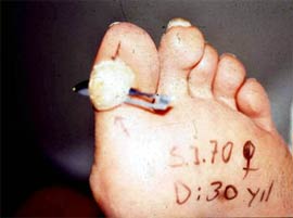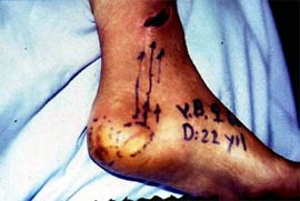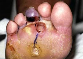 D: Ayak derisindeki çatlak ve deri bozuklukları mikroorganizmalara giriş kapısı ödevi görür. Resimde ayak tabanındaki çatlaklar sonucu gelişen lenfanjit ve abse görülmektedir. |